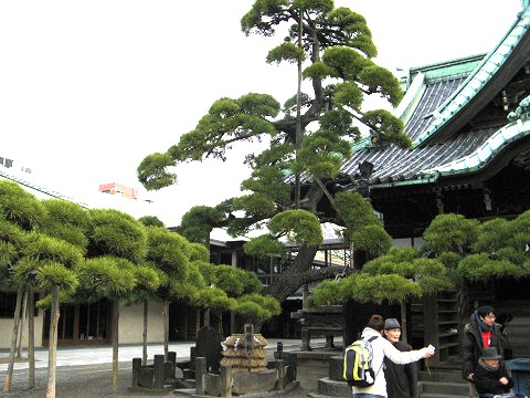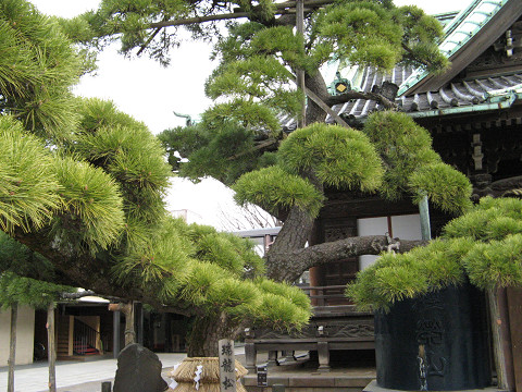 | 都内にあった見事な松を御紹介します。柴又にあるこの松は瑞龍松(ずいりゅうのまつ)といい、 山門の前から本堂前面に枝を這わせる青々とした1本の松です。樹齢380年といわれる老木でありな がらこれほど青々としているのは、毎年根の周りに幅1m・深さ50cmの穴を掘り、そこに一升瓶を 100本、逆さまにして埋めて栄養補給をしているからだといわれており、その姿はまるで帝釈堂の 屋根を空に浮かべる雲のようでした。 |