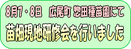 | 平成19年8月7・8日の2日間にわたり、苗畑現地研修会を行いました。広尾町の惣田種苗園様に御協力をお願いしたところ、忙しい時期にもかかわらず、時間を作っていただくことができました。弊社としては、この時期に研修を行うことは少なく、普段はなかなか見ることのできない他社の苗畑を視察できるということで、社員・従業員達は真剣に、楽しく、視察研修を終えて参りました。このような視察を通じて、新たな発見や創意工夫を生み出し、弊社の苗木づくりに活用していきたいと考えております。 |