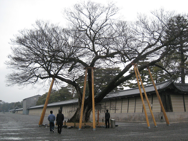 | 京都御所は、元弘元年(1331)、光厳天皇が最初に使用され、明治2年(1869)の東京遷都までの500年 以上の永きにわたり、歴代天皇の居所、執務所でありました。御所は、南北445m、東西250mの築地塀 に囲まれた殿舎郡を指し、東西南北に6つの門、歴代天皇が即位した姉神殿など9殿舎を渡り廊下でつなぎ、 北側に皇后御殿など5殿舎があります。また、小御所には、滝や渓流を配した回遊式庭園があるそうです。 また、京都御所の南西側にある梅林には約200本の梅の木が立ち並び、更に北燐の桃林には約100本の 桃が植えてあり、京都市内でも屈指の場所といわれています。 |
