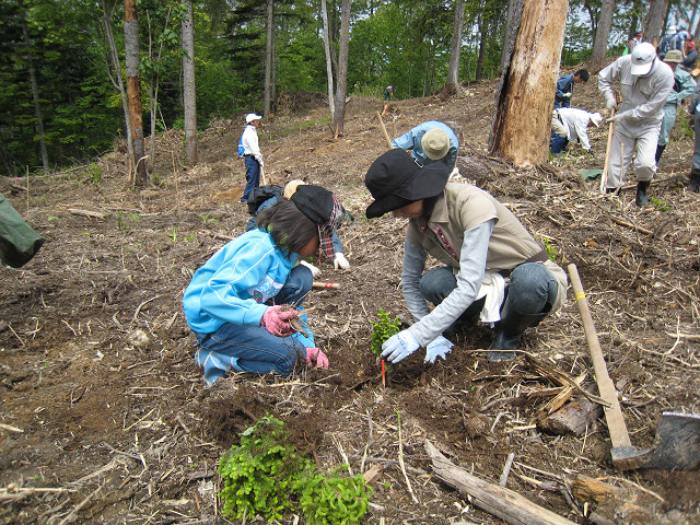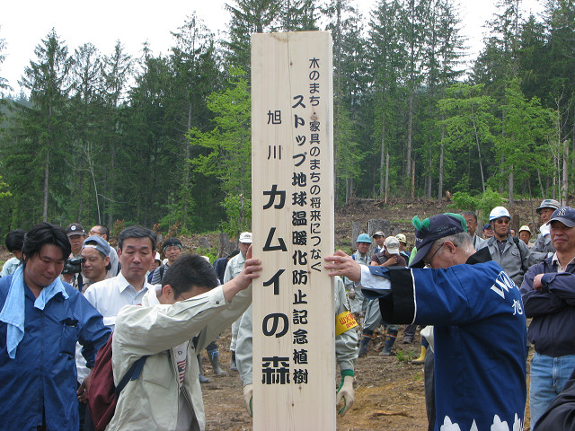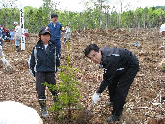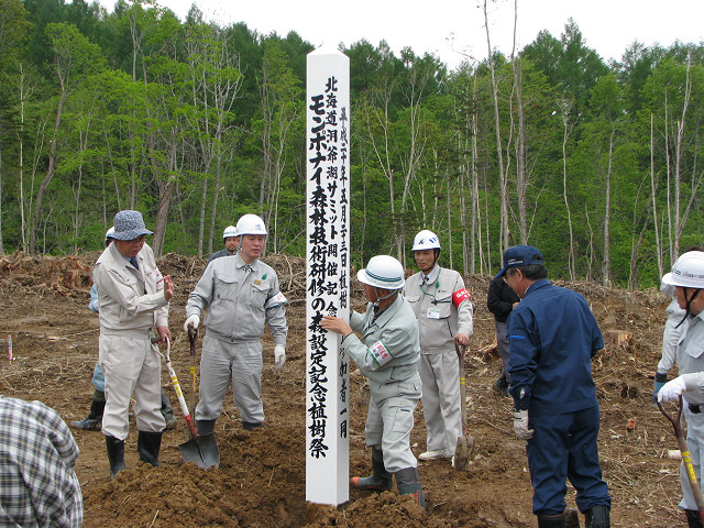| 今、北海道では洞爺湖サミットの開催にあたり、環境への関心がより一層高まる中、各地で記念植樹祭などが 盛んに行われています。弊社も森林・林業に携わるものとして、このような活動に積極的に参加するなど、企業 の社会貢献活動の一環として取り組んでおります。 平成20年5月23日、中川郡美深町で「モンポナイ森林技術研修の森」設定記念植樹祭が開催され、約150名 が参加しました。この研修の森は、道有林での設定は初めてで、地域の林業関係者の技術・知識の向上や交流の 場として活用し、森林を守る人材を育成していくというものであります。 下の写真は、旭川市の更進国有林で行われた「ストップ地球温暖化in旭川」の写真です。この植樹祭は道北の 企業やその家族、森林整備に携わる方々が集まり、約600名が参加しました。記念に設置した標柱には、後世に 向けたメッセージが込められ、森林の恵みが末永く続くことを願いました。 |
