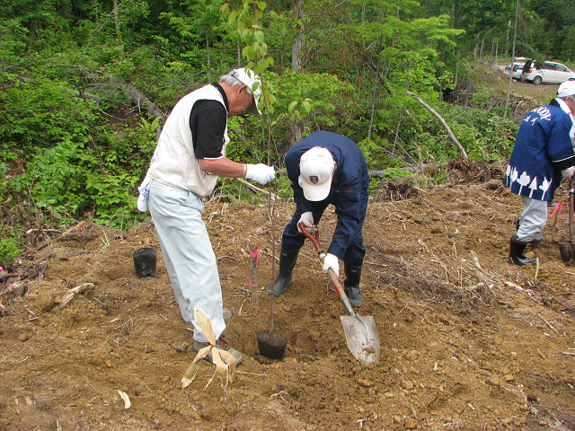 | 代表植樹でエゾヤマザクラを植える当社の矢野顧問 | 当日は社長をはじめ、社員や家族も一緒に参加し、植樹を行いました |