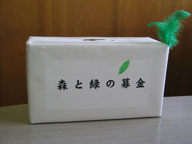 | 堀 達也 理事長と贈呈式にて | 社内で作った森と緑の募金箱 |