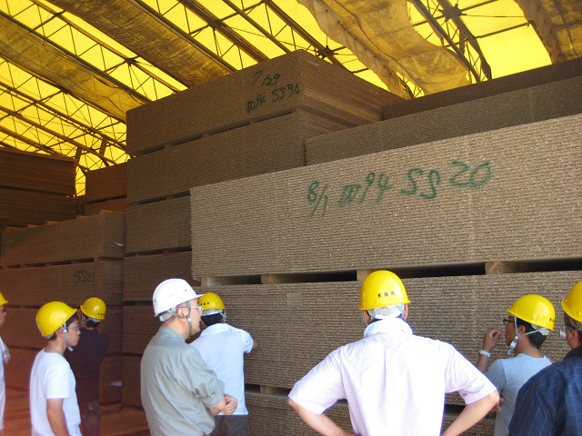| 潟Cワクラの工場見学では、パーティクルボード・木質ペレット製造工程を視察いたしました。パーティクルボードとは、木材チップを細粉して乾燥し、これに接着剤を加え熱圧して作ったものをいい、廃材等からも作ることが出来るそうです。また、潟Cワクラでは、細かい枝等も工場用燃料として使用しており、木を余すことなく利用しているそうです。 | |
