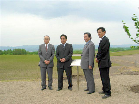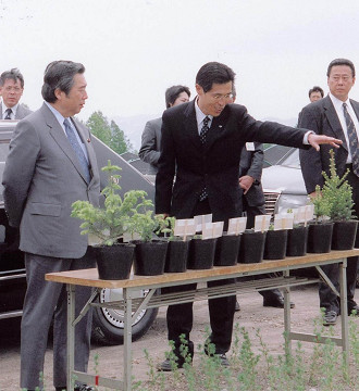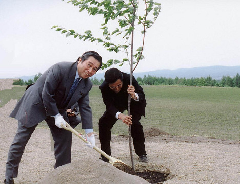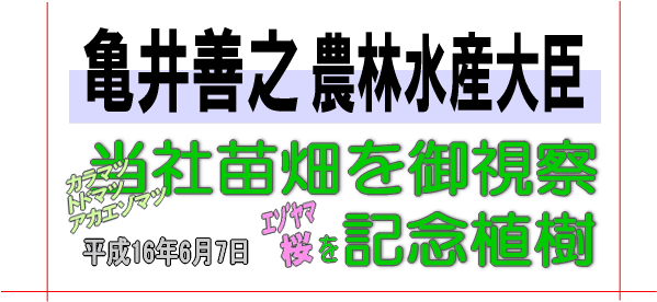 亀井善之農林水産大臣が、 拠|内山林緑化農園の 苗木の生産苗畑を御視察され、 エゾヤマ桜を記念植樹して頂きました。 |