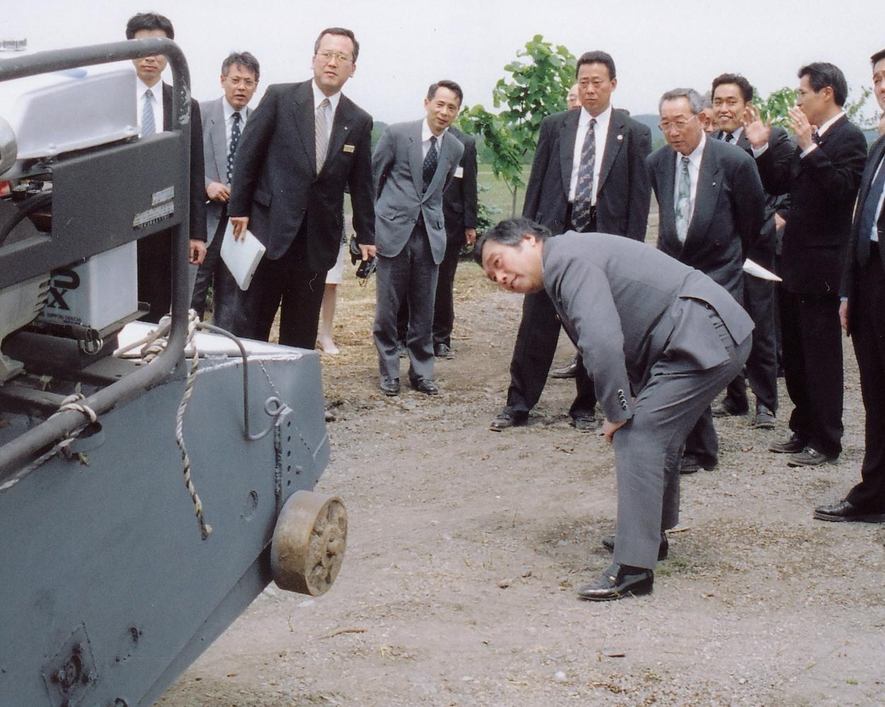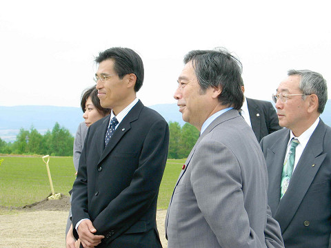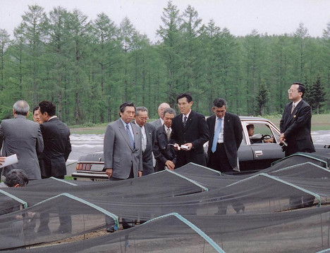 | 6月7日(火)、亀井善之農林水産大臣が拠|内山林緑化農園の山行苗木の生産苗畑を視察されました。拠|内山林緑化農園は、平成九年度第36回農林水産祭にて最高位の天皇杯を拝受し、その後も優良苗木の生産に努めてまいりました。 故竹内泰道を引き継いだ3代目社長竹内一秋は、この数年、新しい苗畑作業機械の自社開発と製作、脱化学肥料を目指した土づくり、そして若い世代の人材育成に力を注ぎ、苗木の安定生産システムを構築してまいりました。亀井農林水産大臣は、当社の苗木生産システムにかねてから関心を寄せて下さり、この度の苗畑視察に至りました。 当日は天候にも恵まれ、当社が製作した作業機械が苗畑現場で整然と稼動する様子を熱心に見学下さり、当社独自の大規模苗木生産システムに感嘆のお言葉と大きな関心を寄せて下さいました。亀井農林水産大臣の一言一言は、新たなる技術開発に取り組む私たちにとりまして、たいへん励みとなる言葉となり、更なる向上心を沸き立たせていただきました。 亀井農林水産大臣は、カラマツ・トドマツ・アカエゾマツ幼苗・成苗各苗畑を巡回視察された後、第7苗畑沼崎にてエゾヤマ桜を記念植樹していただきました。今後、このエゾヤマ桜は当社のシンボルとして、苗木生産技術とともに、大切に育んでまいりたいと思います。 |