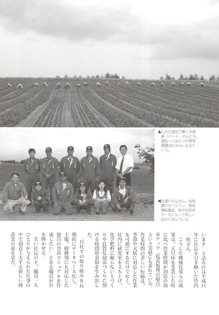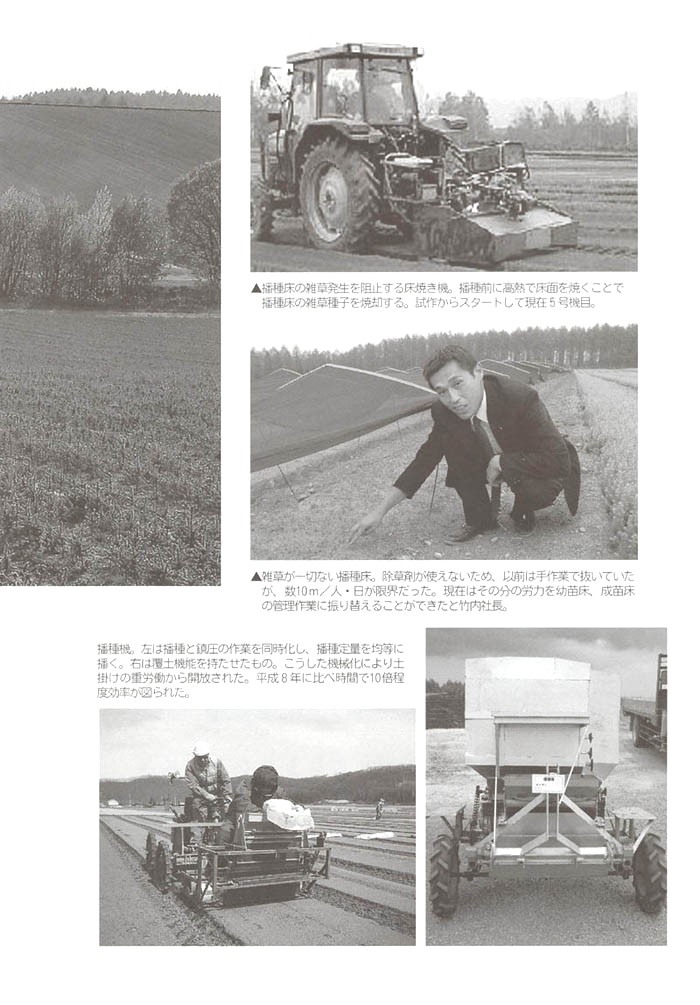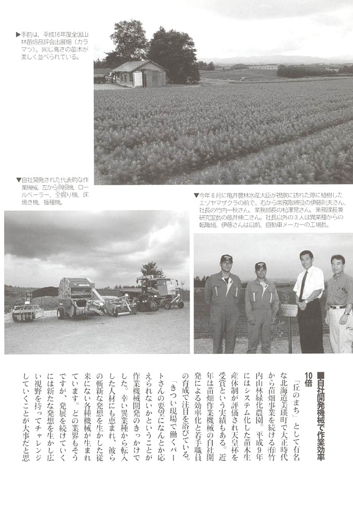 | 社団法人全国林業改良普及協会が発行する『GR現代林業』10月号にて、有限会社竹内山林緑化農園独自の機械化による苗木生産システムが掲載されました。 平成11年、竹内一秋が社長に就任して以来力を注いできた、種苗業における「若手人材の育成」と、当社が独自に開発した「苗木生産用機械の効率性」を中心に当日の取材が進みました。苗畑において、松澤業務部長・藤井同課長が床焼き機など開発機械の稼動成果を説明し、竹内社長・伊藤常務は独自機械の開発の考案製作におけるエピソードや意外なオプション装置などを紹介しました。 |