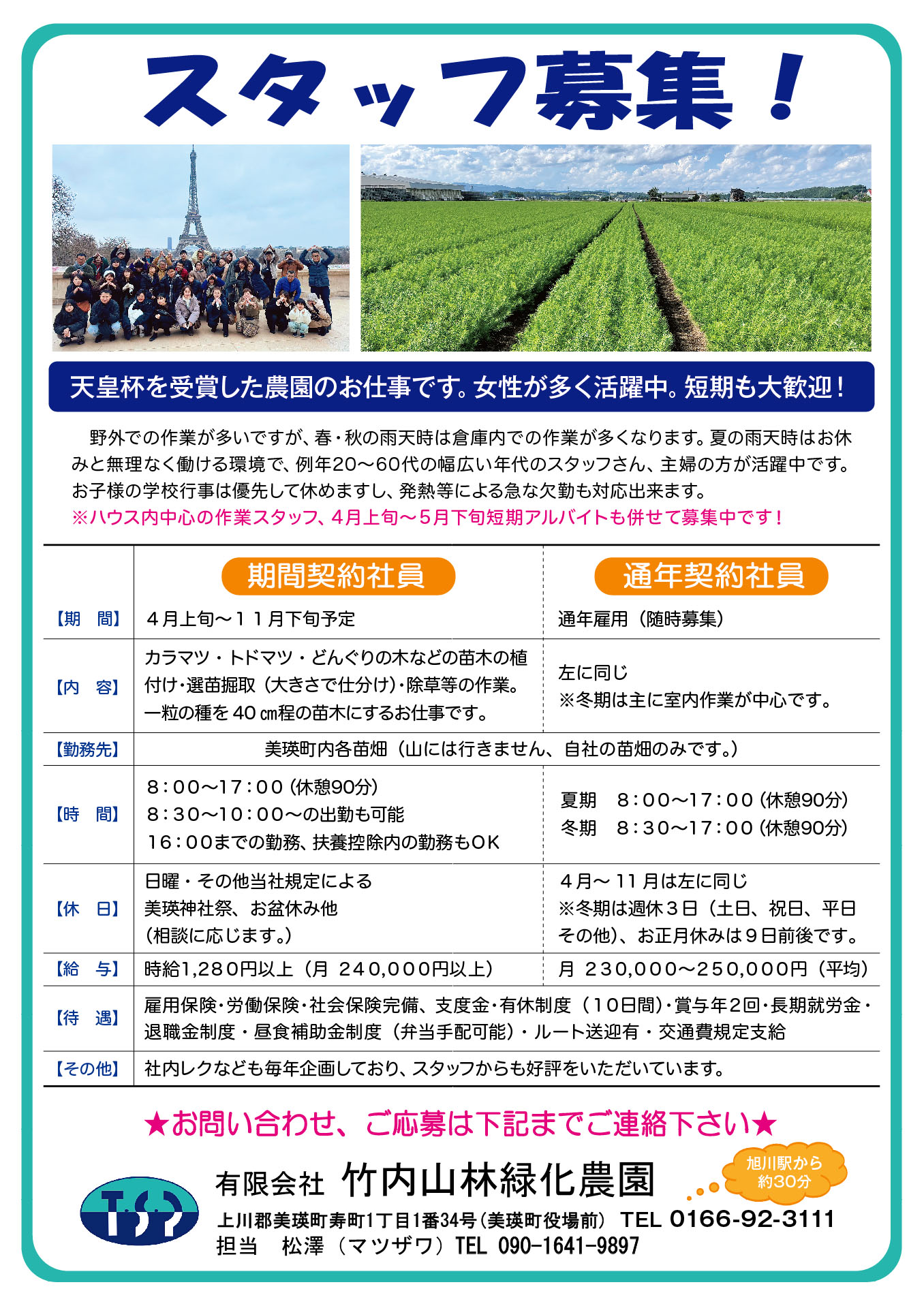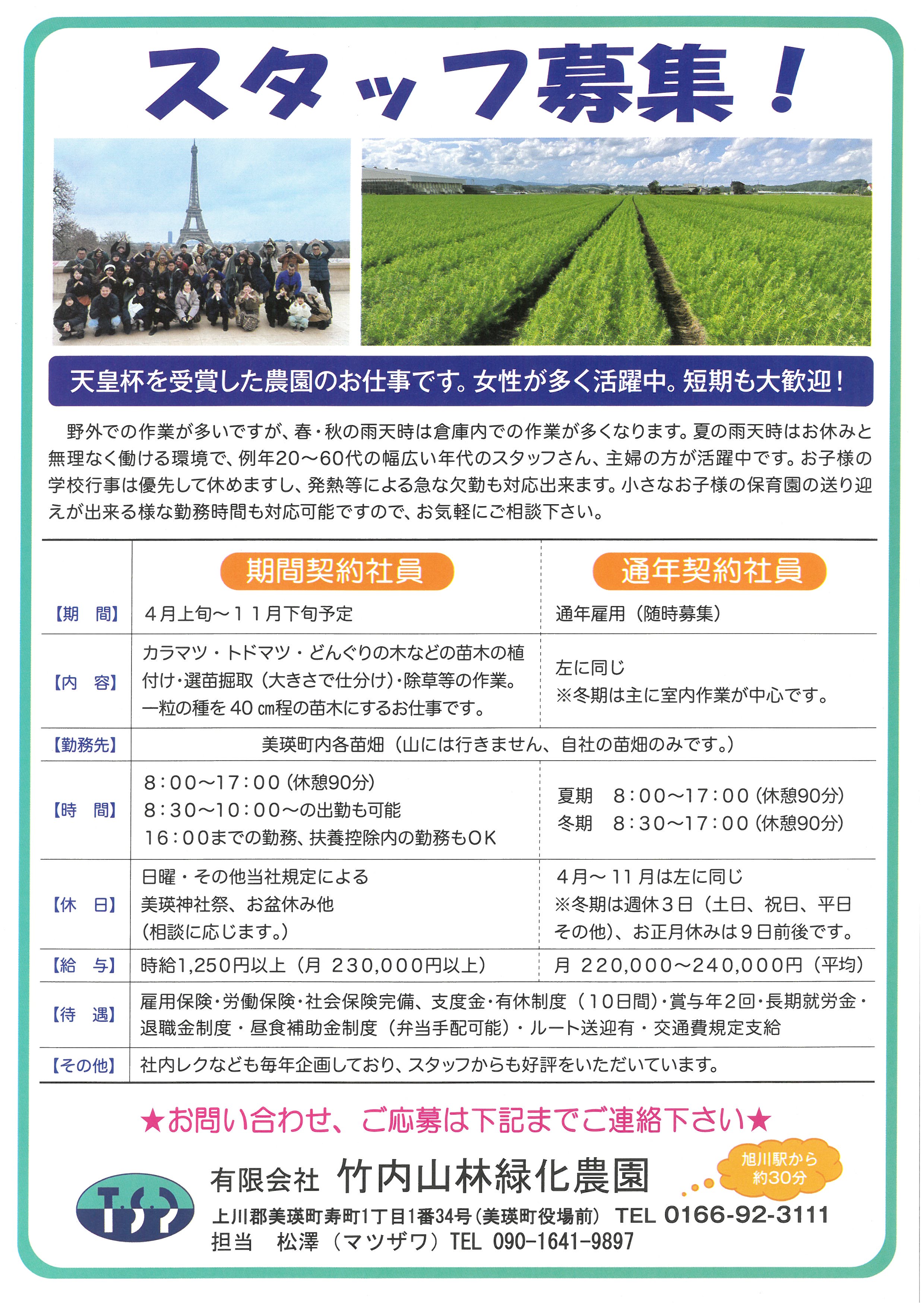 竹内山林緑化農園は「丘のまち美瑛町」で品質の良い丈夫な木の苗を育てています。